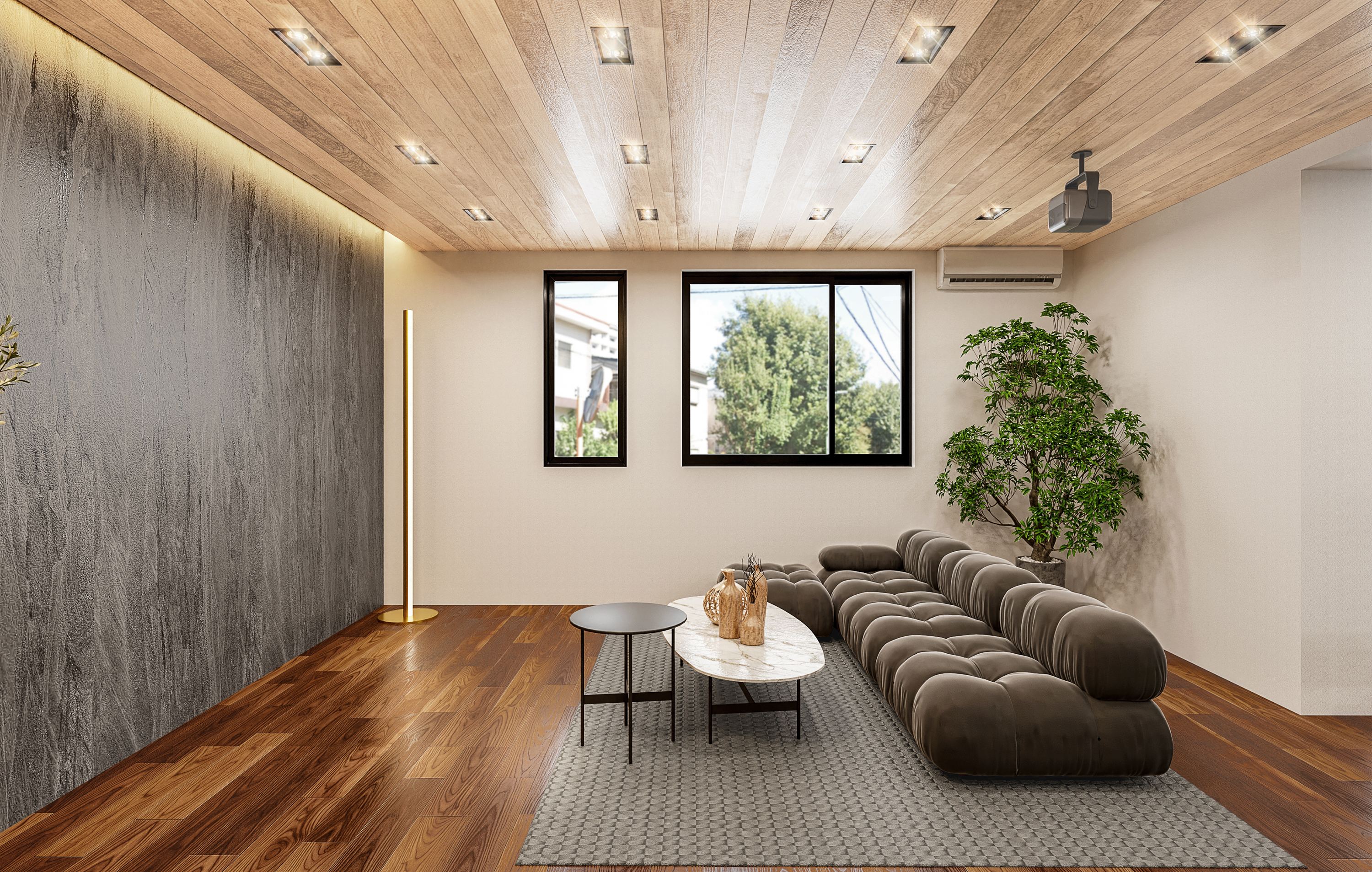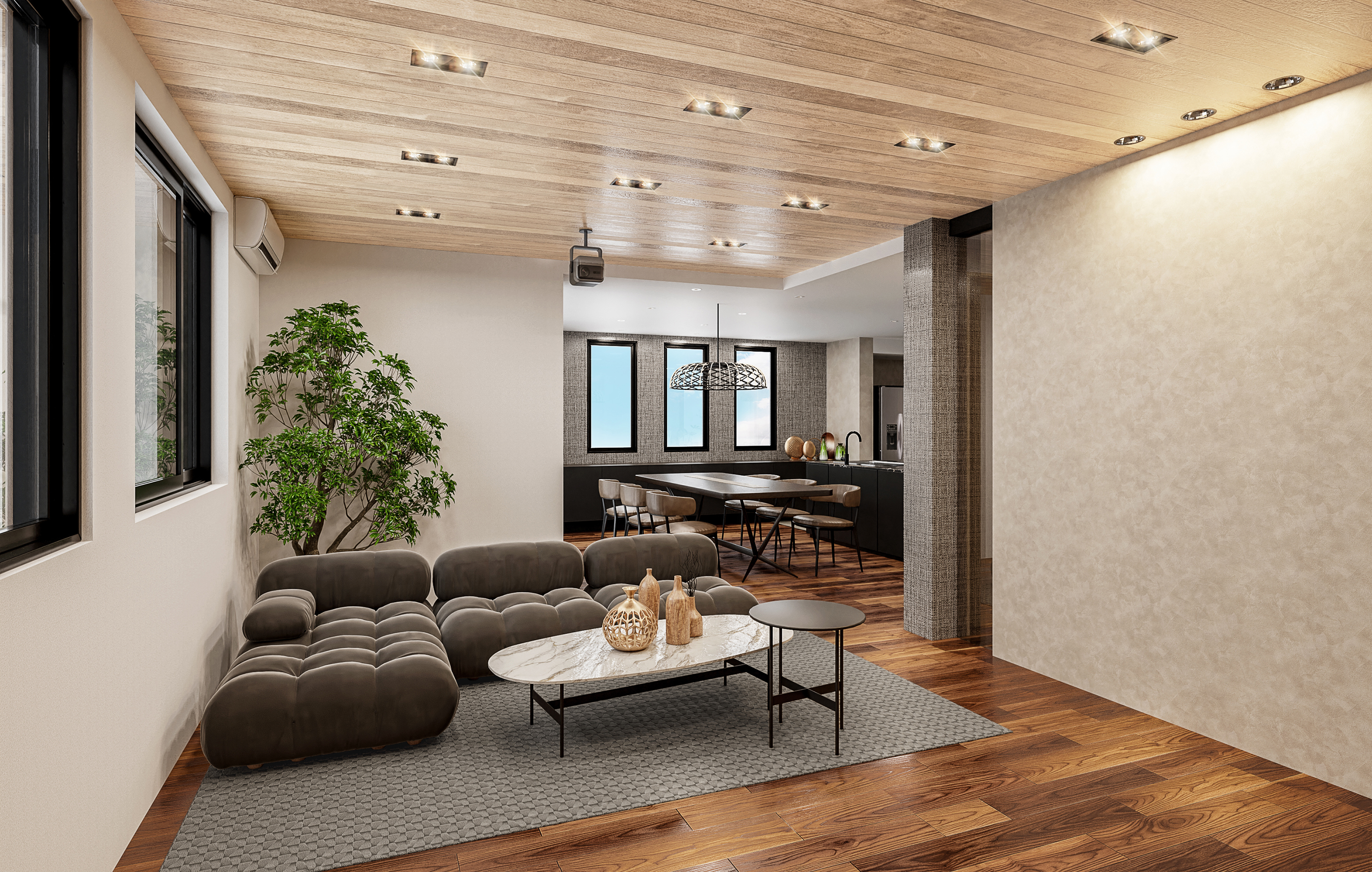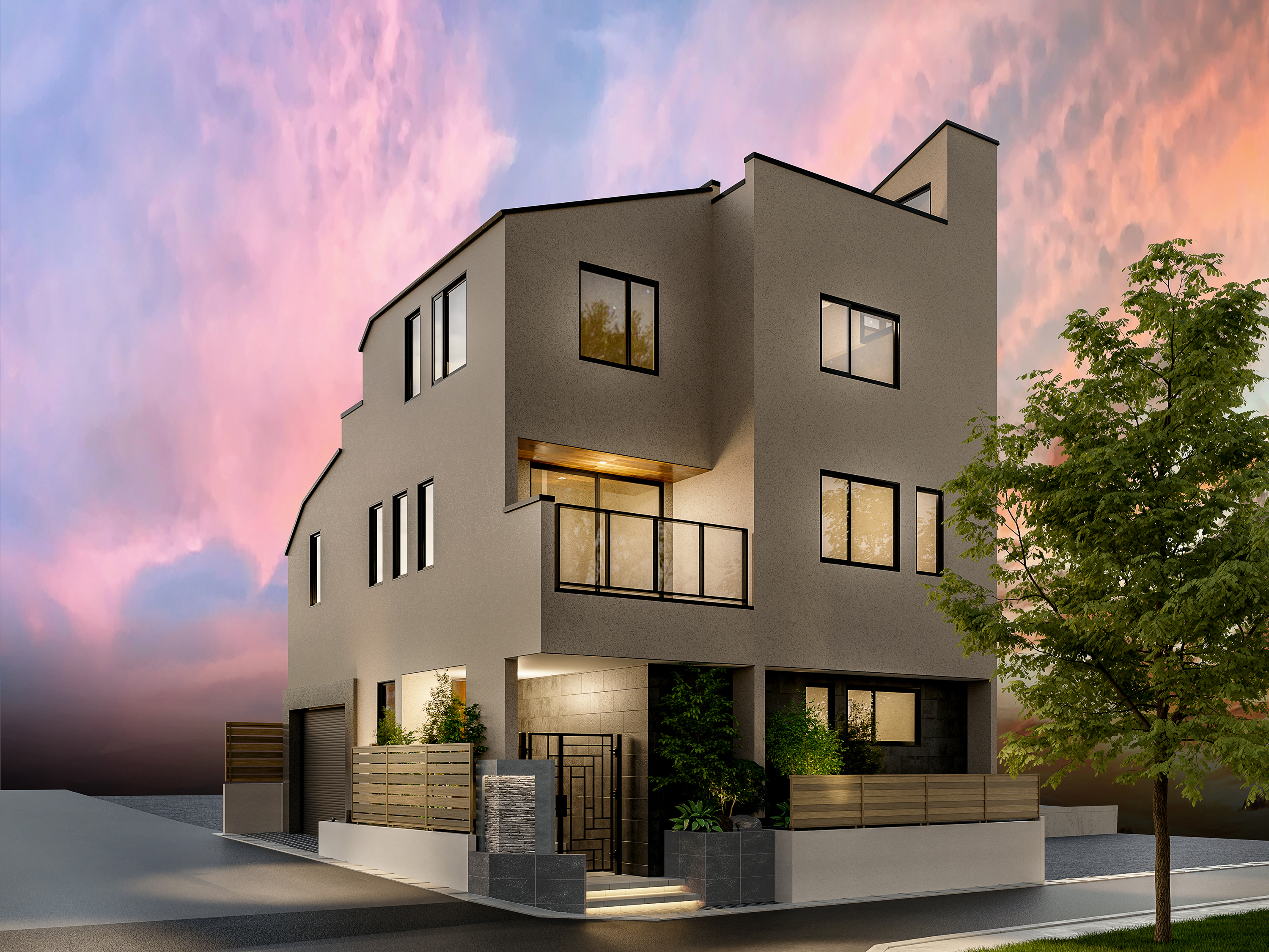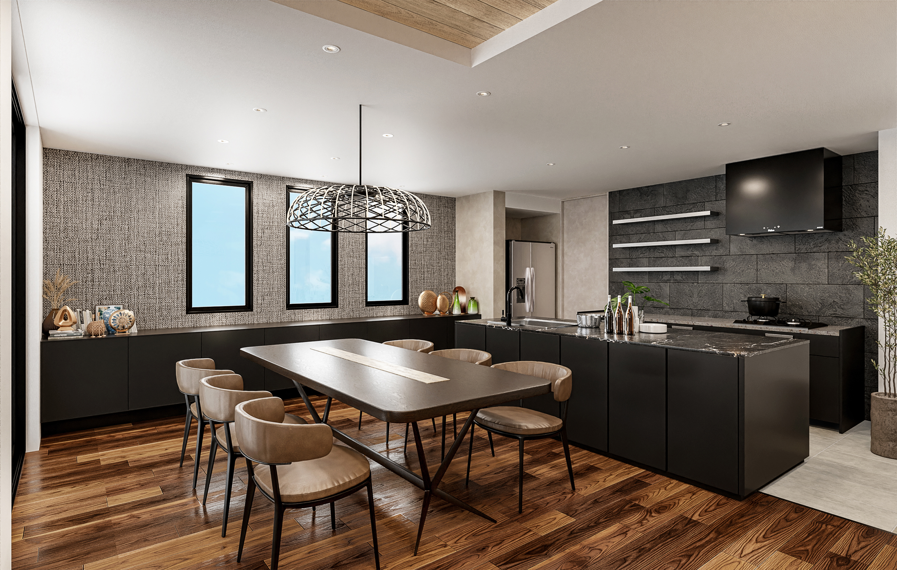 住宅の外観と内観のセットパースを作成させていただきました。 外観は夕景を背景に建物の立体感と落ち着いた素材感を意識し、温かみのある光で住まいの安心感を表現しました。 内観は照明の多さが特徴的な案件でしたので家具や什器にツヤ感をだして高級感を演出しております。