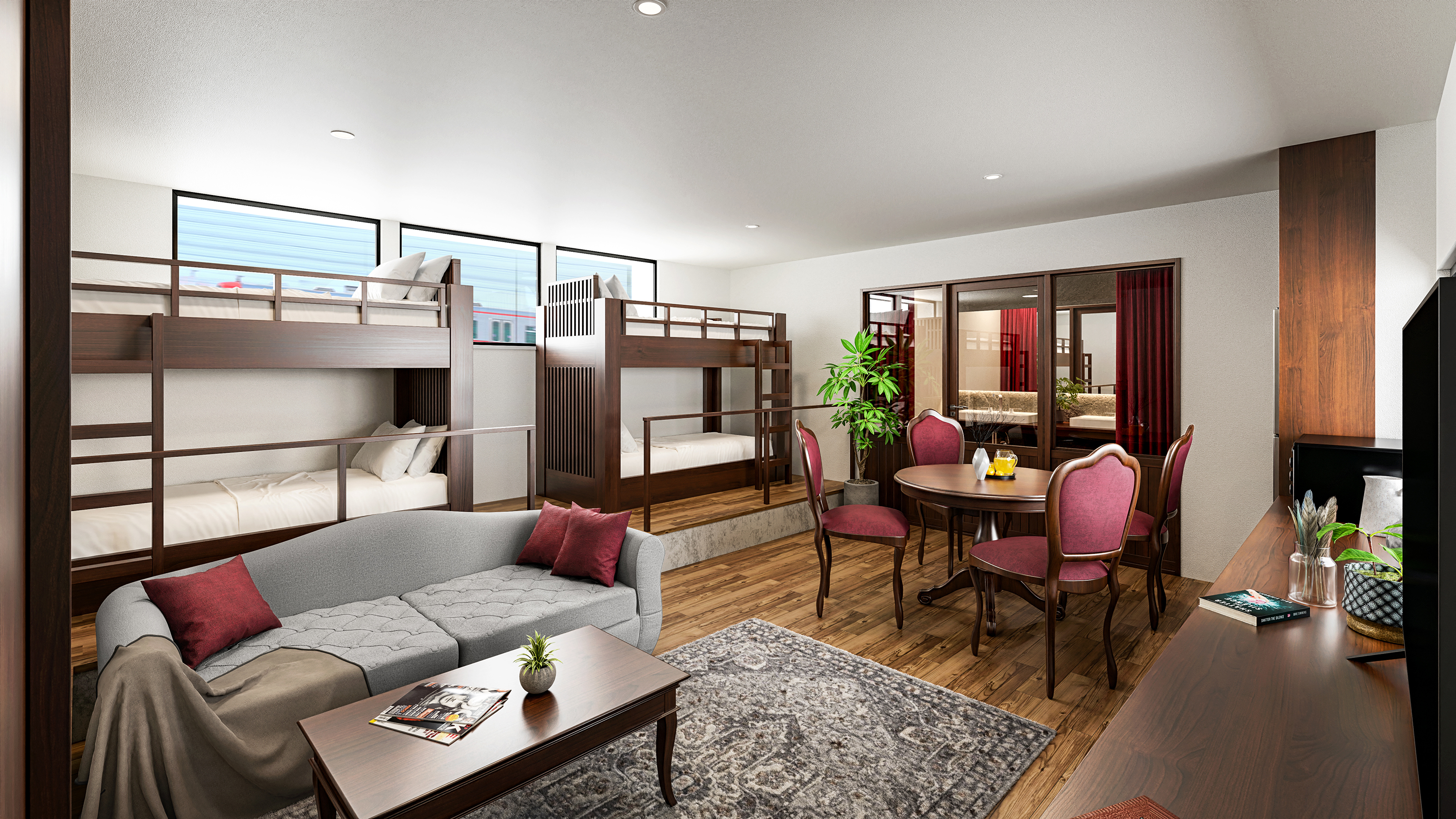 実際に滞在したときの空間体験が自然に伝わることを重視しました。駅舎ホテルという特別な空間。デザインも古風な駅舎風でしたのでリッチ感があるような質感に調整しております。 窓の外には電車がみえるようにアングル角度も調整。間接照明とダウンライトのバランスに配慮し、昼夜どちらのシーンでも落ち着いた雰囲気になるよう光の強弱を調整しています。